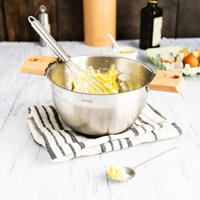Bol de préparation en cul de poule inox 18-10 brossé avec socle anti-glisse en silicone intégré. Gradué à l'intérieur, il est utilisable avec poignées ou anses amovibles pour un meilleur maintien.