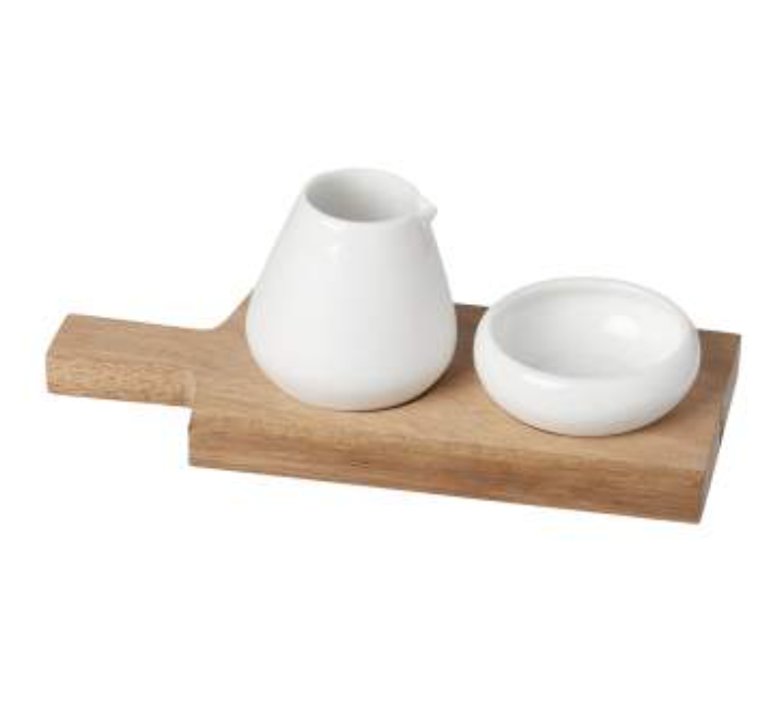 Set 3 pièces • Matériaux : acacia bois + porcelaine blanche.