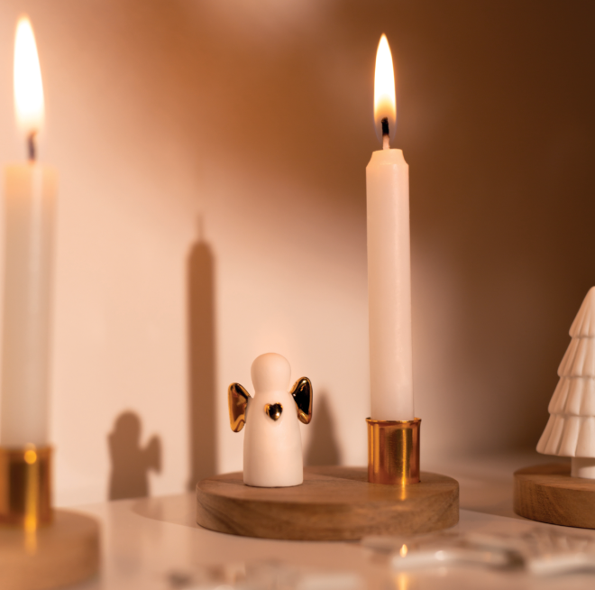 Petit support lumineux décoré d’un ange, idéal pour une ambiance douce.