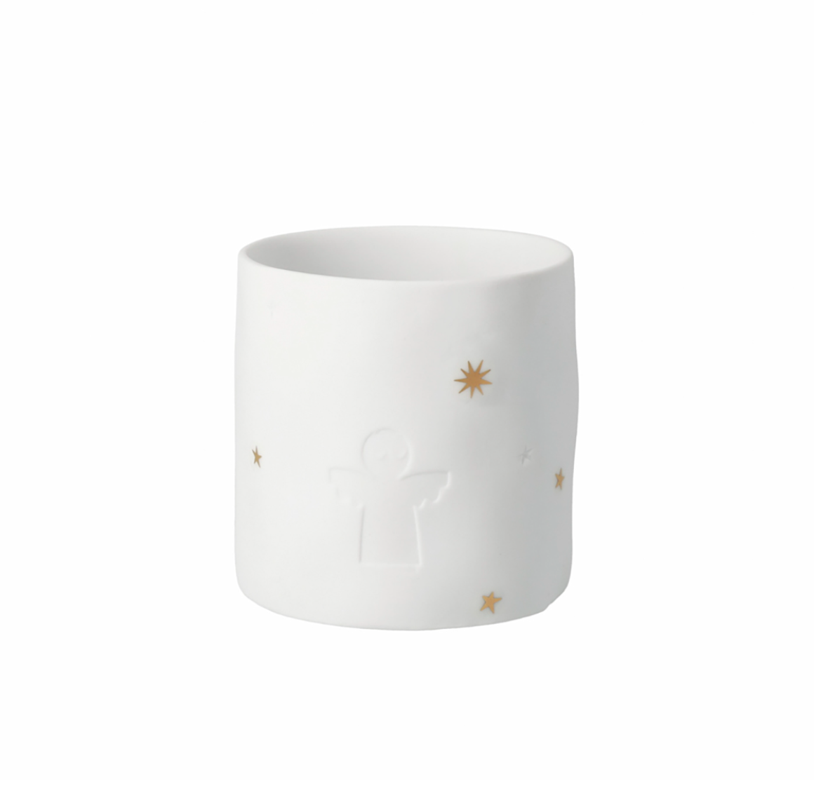Petit photophore en porcelaine mate, décoré d’un motif ange avec touches dorées — idéal pour une ambiance chaleureuse cet hiver.