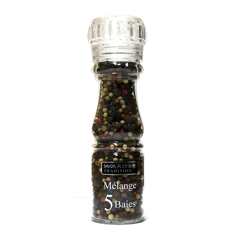 Liste des ingrédients : Poivre noir, poivre blanc, poivre vert, piment de Jamaïque, baies roses.