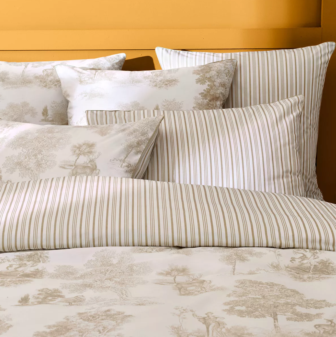 Imprimé “toile de Jouy” en all-over au recto, verso rayures verticales : un design double-face coordonné.