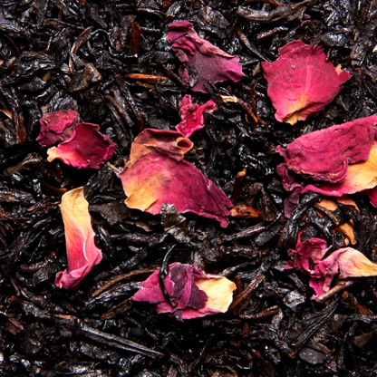 Mélange d’une sélection de thés noirs aromatisé à l’orange, aux amandes, et à la pêche avec des pétales de rose.