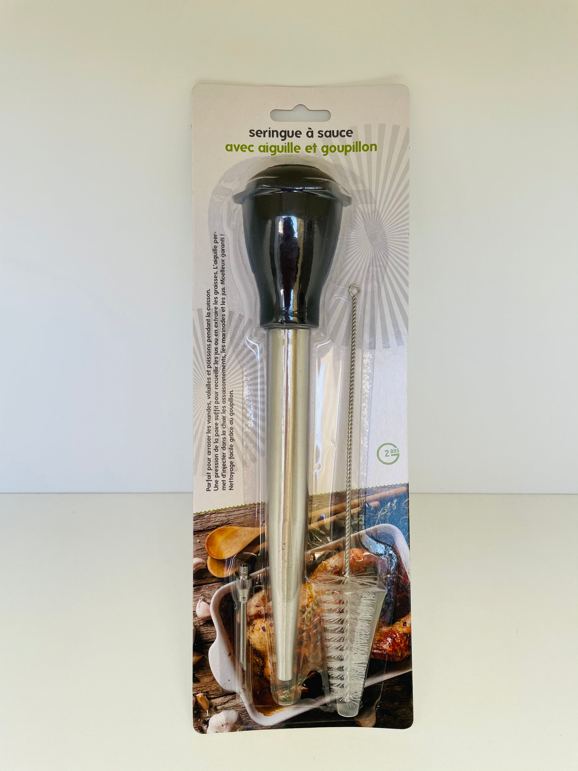 Cette seringue à sauce est parfaite pour vous aider à saucer votre viande durant sa cuisson. Livrée avec une aiguille et un goupillon, vous pourrez également injecter de la sauce sous la peau de votre poulet pour le rendre encore plus parfumé! Pour la nettoyer, il vous suffira simplement d'insérer le goupillon sous un filet d'eau chaude et un peu de liquide vaisselle. Une pression sur la poire suffit pour recueillir les jus ou en extraire les graisses.