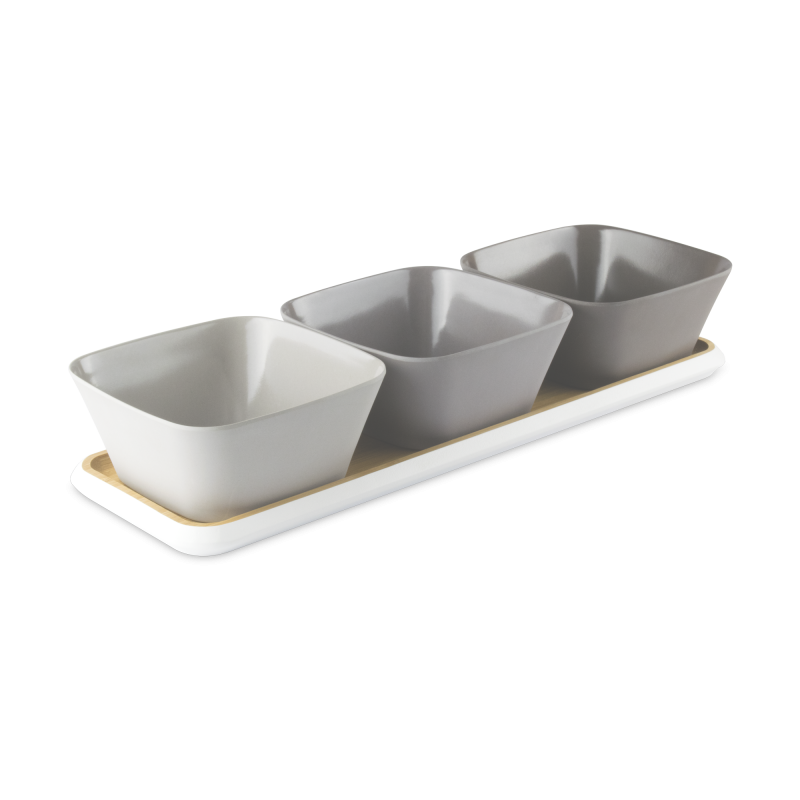 Le set apéro Pebbly se compose d’un plateau en bambou et de trois bols en fibre de bambou à la forme carrée et aux bords arrondis. Ces trois bols se distinguent par un dégradé de gris, du plus clair au plus foncé.