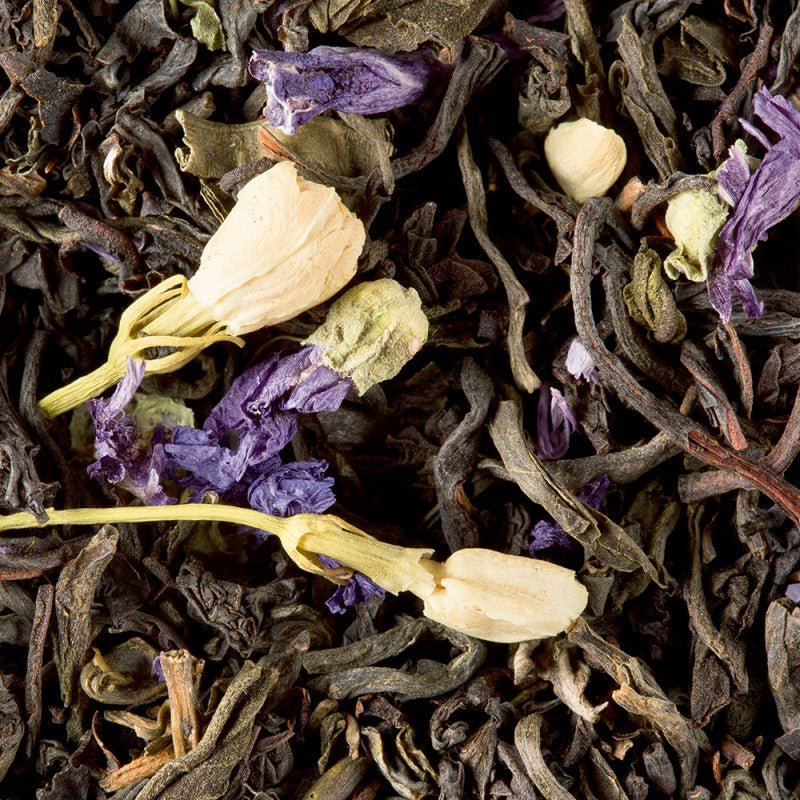 Thé noir, thé vert, thé vert au jasmin, pétales de fleur, arômes (bergamote, vanille)